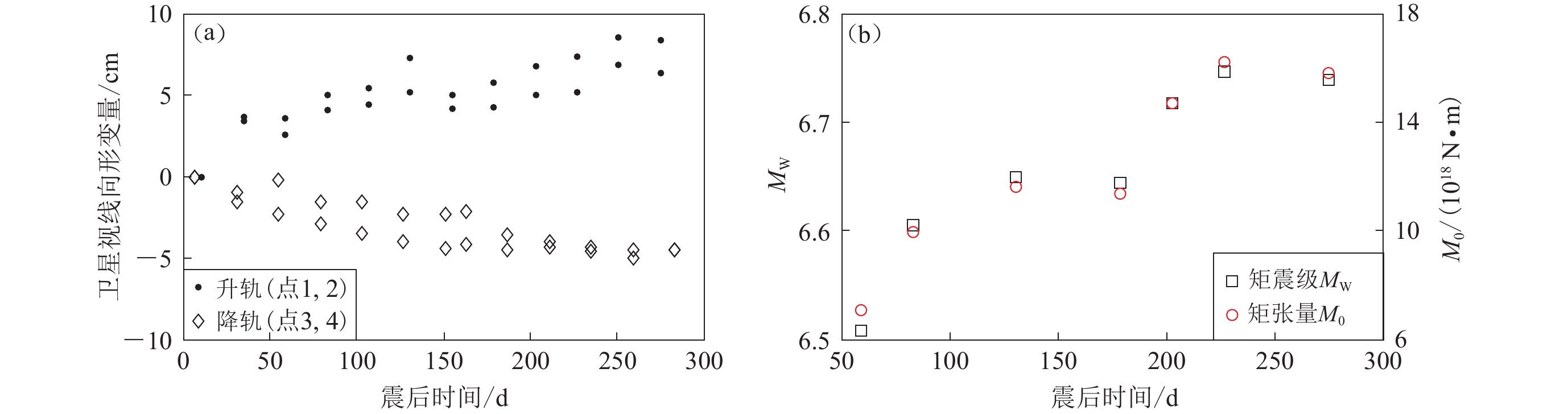MW6.0 earthquake region was obtained by using differential interferometry technique, and the inversion results of seismogenic fault parameters were used as receiving fault parameters for stress calculation. The results show that the post-seismic deformation of the Sarpol Zahab earthquake is mainly dominated by the afterslip effect. 283 days after the earthquake, the accumulative slip of the after-slip model reaches up to 0.7 m. The coseismic source model of the Javanrud