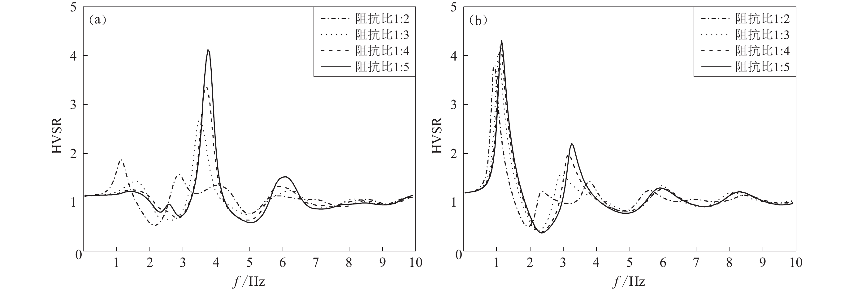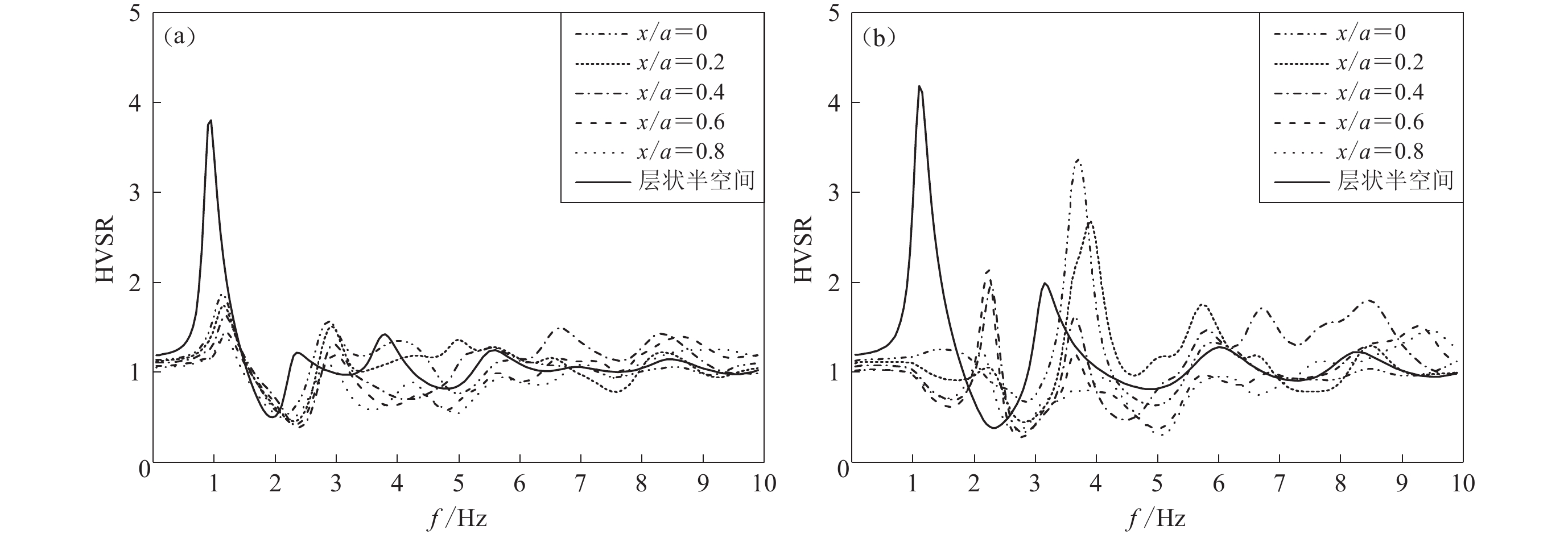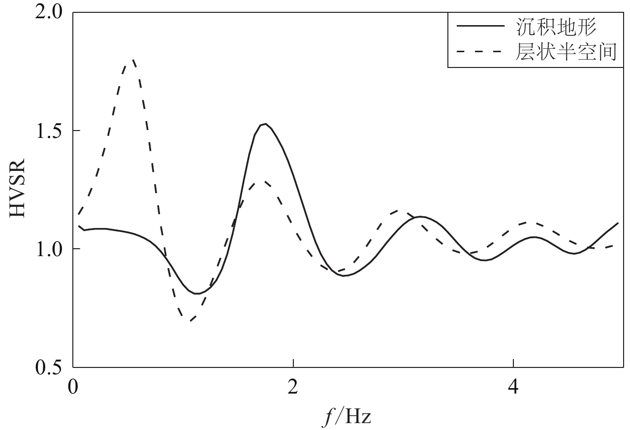 et alwas adopted to simulate the HVSR curves of 2-D sediment topography by calculating the imaginary part of Green’s functions of total wave field. The imaginary part of Green’s functions was solved by the dynamic stiffness matrix and in-plane inclined Green’s functions based on the indirect boundary element method (IBEM). The HVSR curves of 2-D sediment topographies and corresponding 1-D layered half-space were compared, the influences of sediment topography shapes and the relative position of calculation points on the HVSR curve were discussed in detail. The results show that the effect of impedance ratio between inside and outside materials of sediment topography on HVSR is the most significant; With the increase of the impedance ratio and the slopes of the interface on the sediment side, the frequencies of the first peak of HVSR curves increase significantly, which can be up to 3.3 times of the corresponding layered half-space results, simultaneously, platform emerges on HVSR curves; Amplitudes of HVSR curves in high frequency band increase with the decrease of distances from the calculation points to the sediment boundary. According to the results obtained in this study, the HVSR method can be used to preliminarily determine the place where local sediment topography exists. From this aspect, the cost of regional geophysical investigation can be reduced visibly via HVSR method.