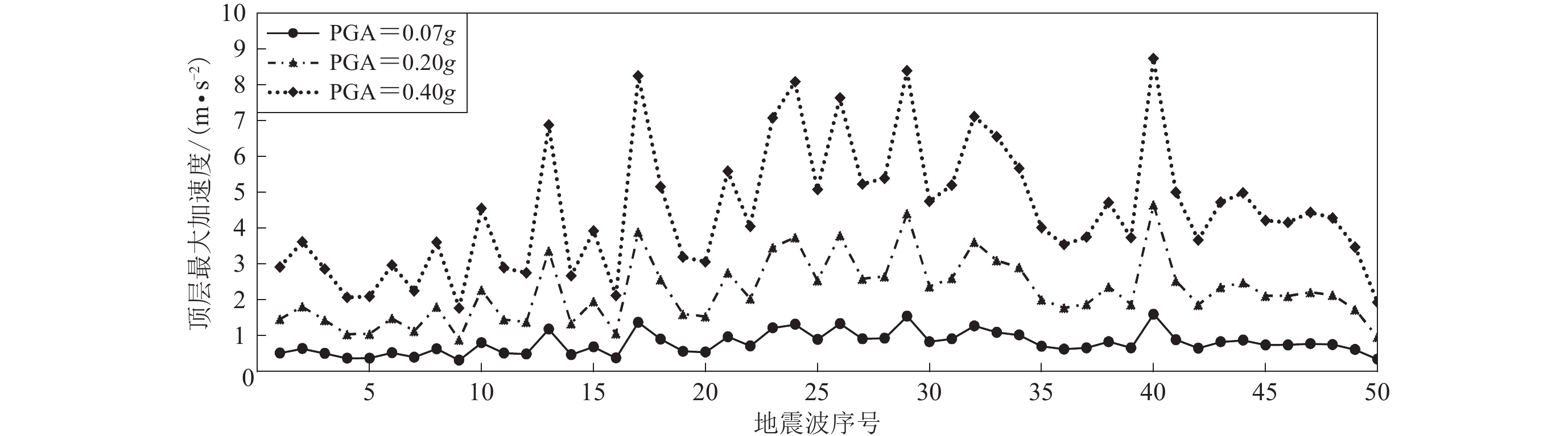 T and the pulse energy, while the influence of the zero-crossing times of the acceleration curve corresponding to the velocity pulse needs to be considered. Furthermore, the equipment response is directly related to the top floor acceleration, but there is no significant direct correlation with the pulse characteristics of near-fault ground motions.