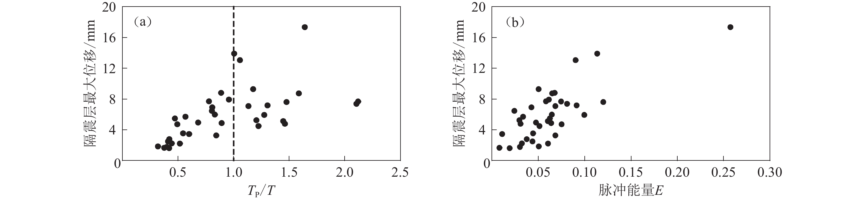 T=1 as the dividing line; and the relationships between the displacement ratio of isolation layer and the period ratio and pulse energy were fitted while the zero-crossing times is not less than 5. The analyses show that the influence of pulse characteristics on the structure is mainly related to the period ratio