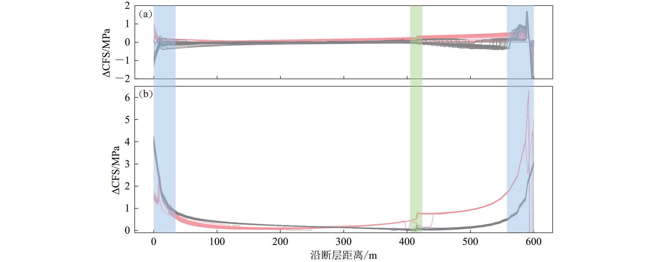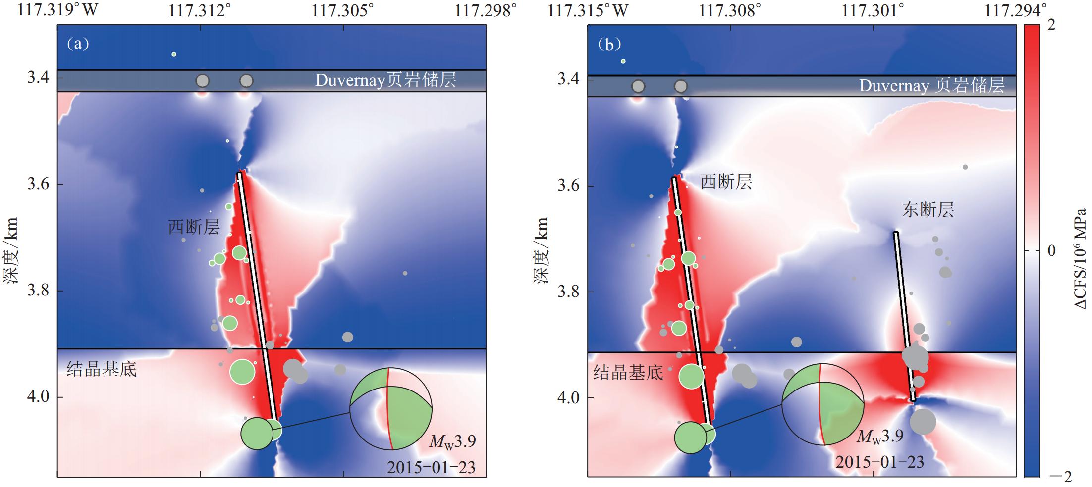 In the case when only the presence of the western fault is considered, after 5 days of water injection and 15 days of fluid diffusion, a high ∆CFS value area with 2.56 MPa appeared at the endpoint of the western fault, and a high ∆CFS value area with 1.62 MPa appeared near the MW3.9 earthquake rupture point. In the case of two faults coexisting, the above ∆CFS high-value areas increased to 2.98 MPa and 2.11 MPa, respectively. This indicates that the ∆CFS concentration area of the eastern fault in the crystalline basement has made the Coulomb stress of the western fault increase to some extent, leading to the western fault more prone to activation. It should be noted that a ∆CFS high-value connection zone has formed between the eastern and western faults in the crystalline basement, which is the result of mutual stress disturbance between adjacent faults (Fig.1p). When the stress of a certain fault reaches its critical value, it will be activated first.