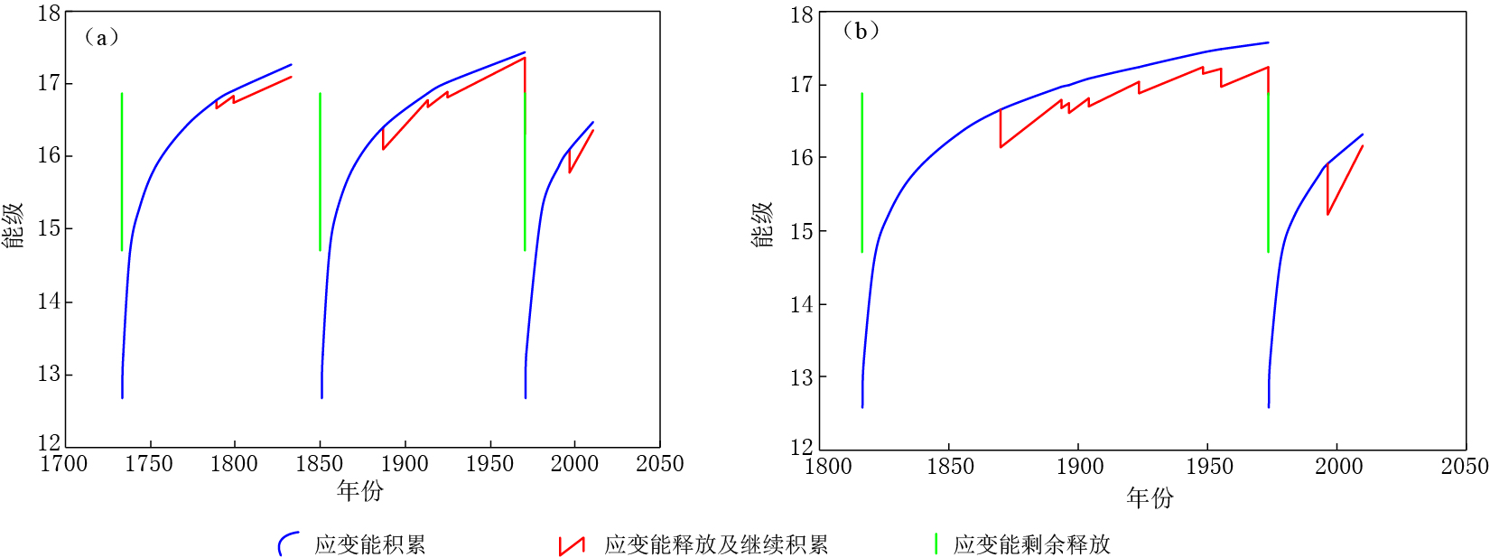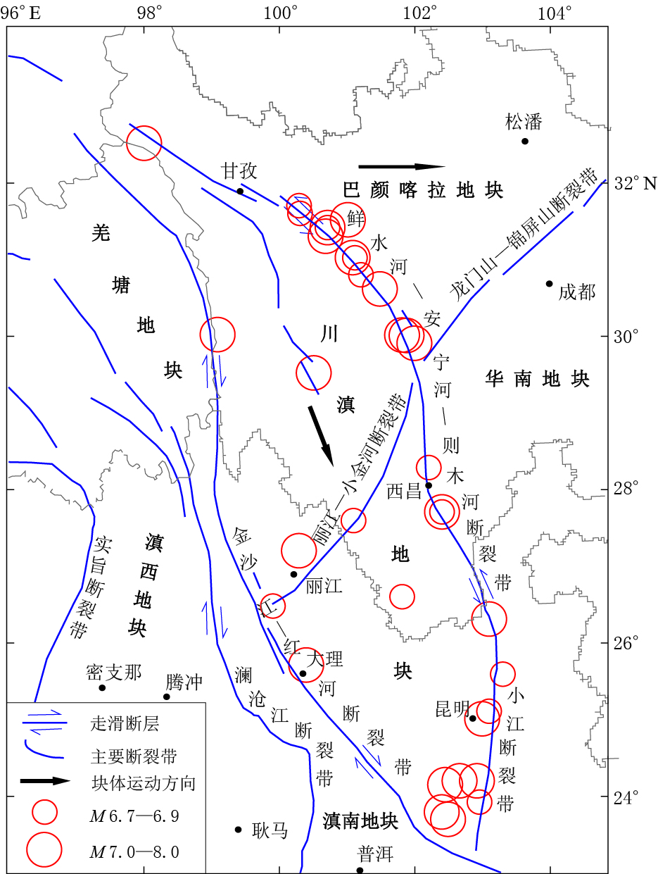 M≥7.5) occur. Thus, the old cycle ends and a new cycle starts. Obviously, the quiet to active periods are caused by the cycle of strain energy accumulation from small to great, and then to completely releasing. Active stage is much longer than the quiet one. Therefore, it is unsuitable to discuss the quiet-active period for a great geographic area covered by many blocks or to discuss the repeat period of single strong earthquake for a small region. Although the occurrence of strong earthquakes does not obey any law in time, the magnitude predicted by the strain energy accumulating-releasing curves is coincident with the real one, which may be significant for seismic safety evaluation.