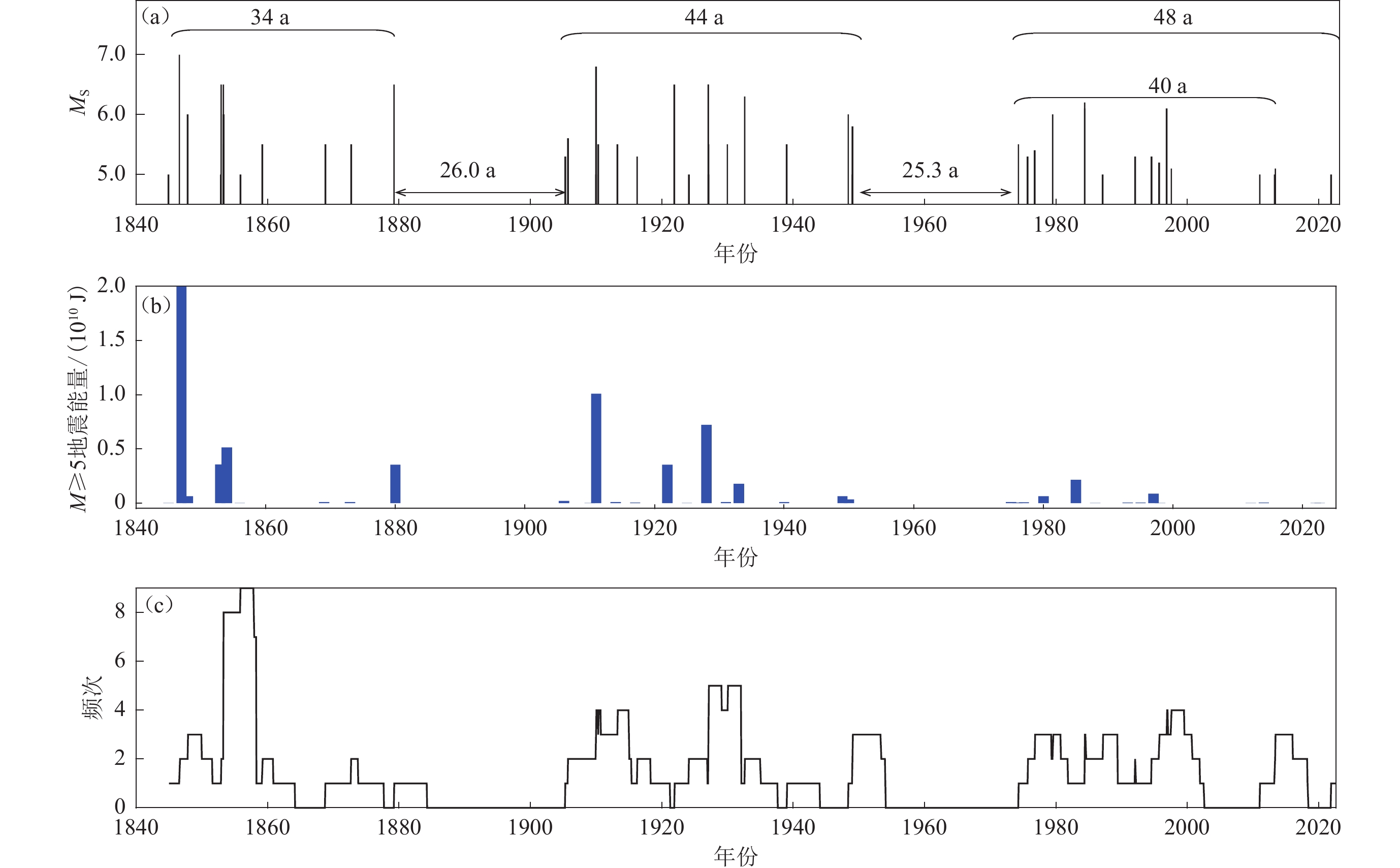 M≥5.0 earthquakes can be divided into active periods Ⅰ (1844−1879), Ⅱ (1905−1949), and Ⅲ (1974 to present). Since 1997, the seismicity in the western Ludong-Huanghai block has been in the weak release stage at the end of the active period; ② In the three active periods, the main seismic areas are different. In the first and second active periods, the seismicity in the sea is dominant, and the earthquakes in the sea are stronger than those in the land, while in the third active period, it is very different. In which,